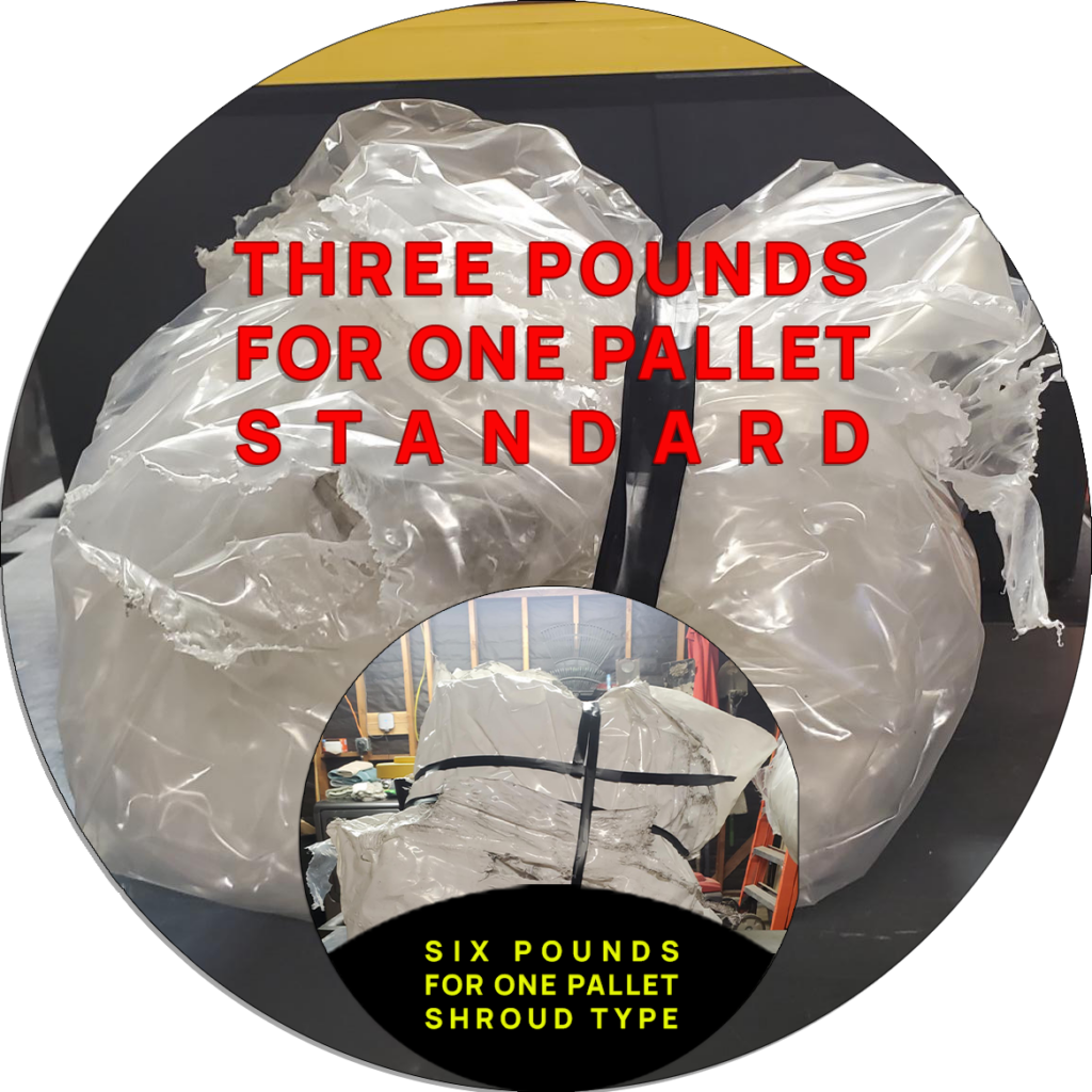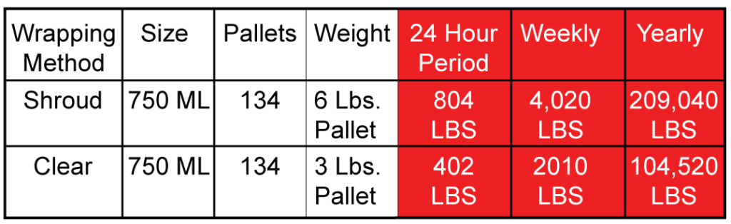 The image to your right shows three pounds worth of standard plastic wrap, which was removed off of a 44X56 pallet of 750mL bulk glass. The image layered on the top shows a shroud style wrap that comes out to roughly six pounds. Please look at the graphic below because its pretty amazing how much plastic the glass bottle and jar industry creates for their customers (you) to deal with.